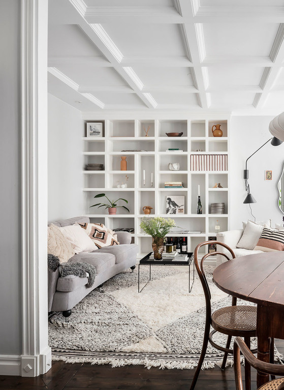 Käytännöllinen, lattiasta kattoon ulottuva kirjahylly olohuoneessa