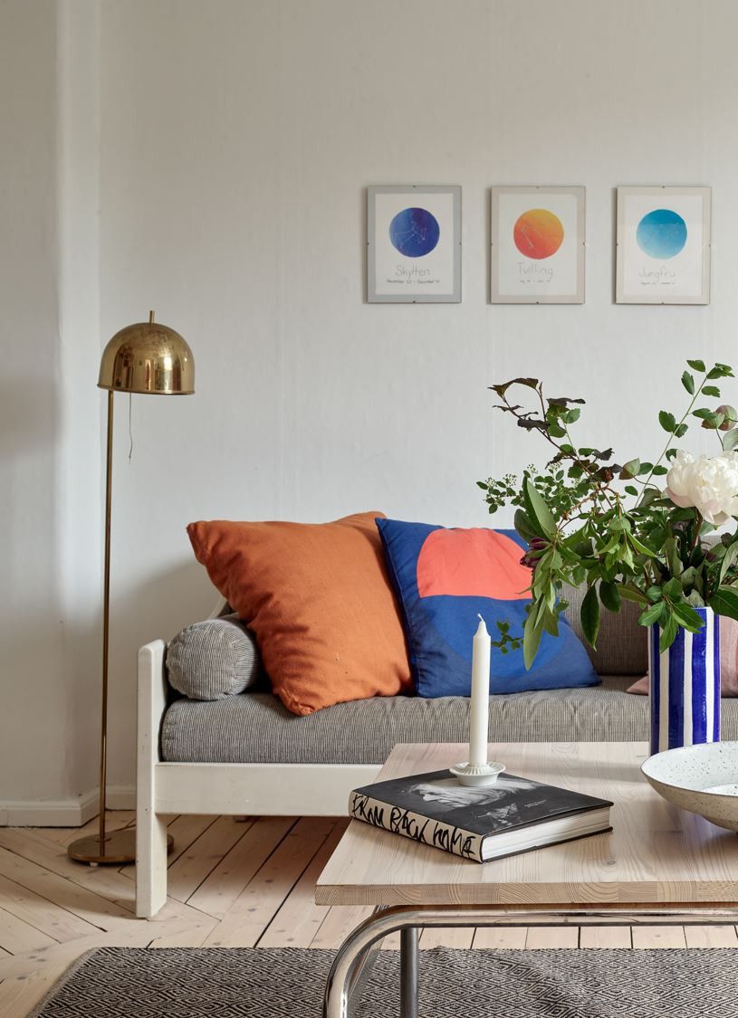 Viihtyisä olohuone kauniilla väriroiskeilla