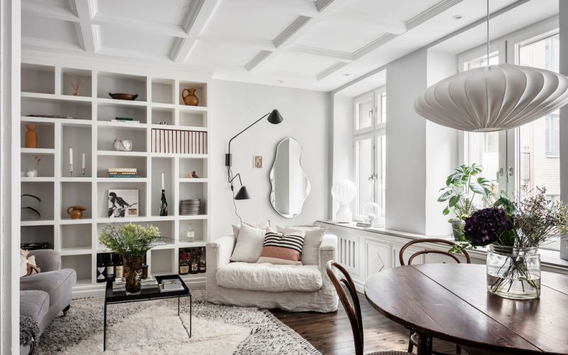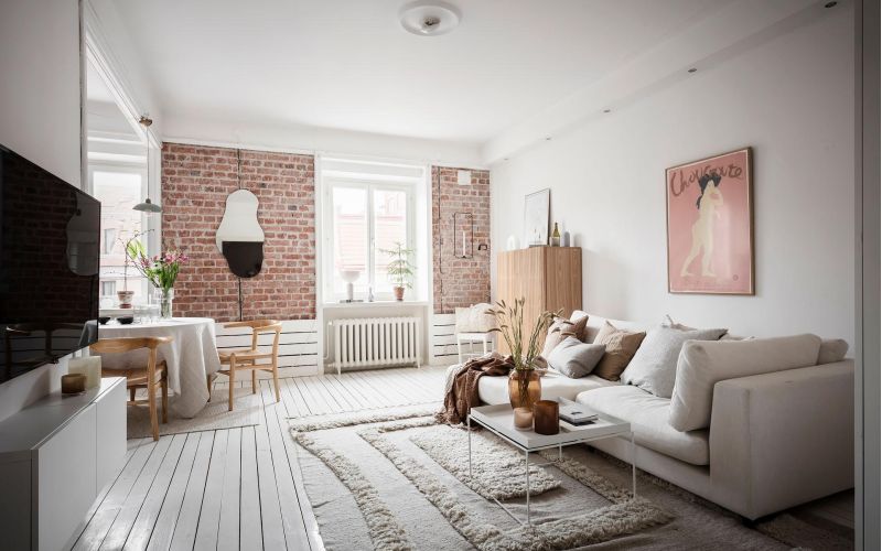 Näkymä, joka avautuu sisään astuessamme asuntoon, johdattaa meidät välittömästi makuutilaan, pieneen työpöytään ja viihtyisään olohuoneeseen. Nämä kolme toiminnallista osaa on järjestetty nerokkaasti yhteen tilavaan tilaan luoden tilan, jossa voit rentoutua, työskennellä ja valmistaa ruokaa tinkimättä arjen mukavuudesta ja tyylistä. Oleskelemaan ja rentoutumiseen kutsuva sohva on sijoitettu strategisesti niin, että se ei ole vain mukava, vaan myös visuaalisesti viehättävä ja samalla osa toimivaa ratkaisua.