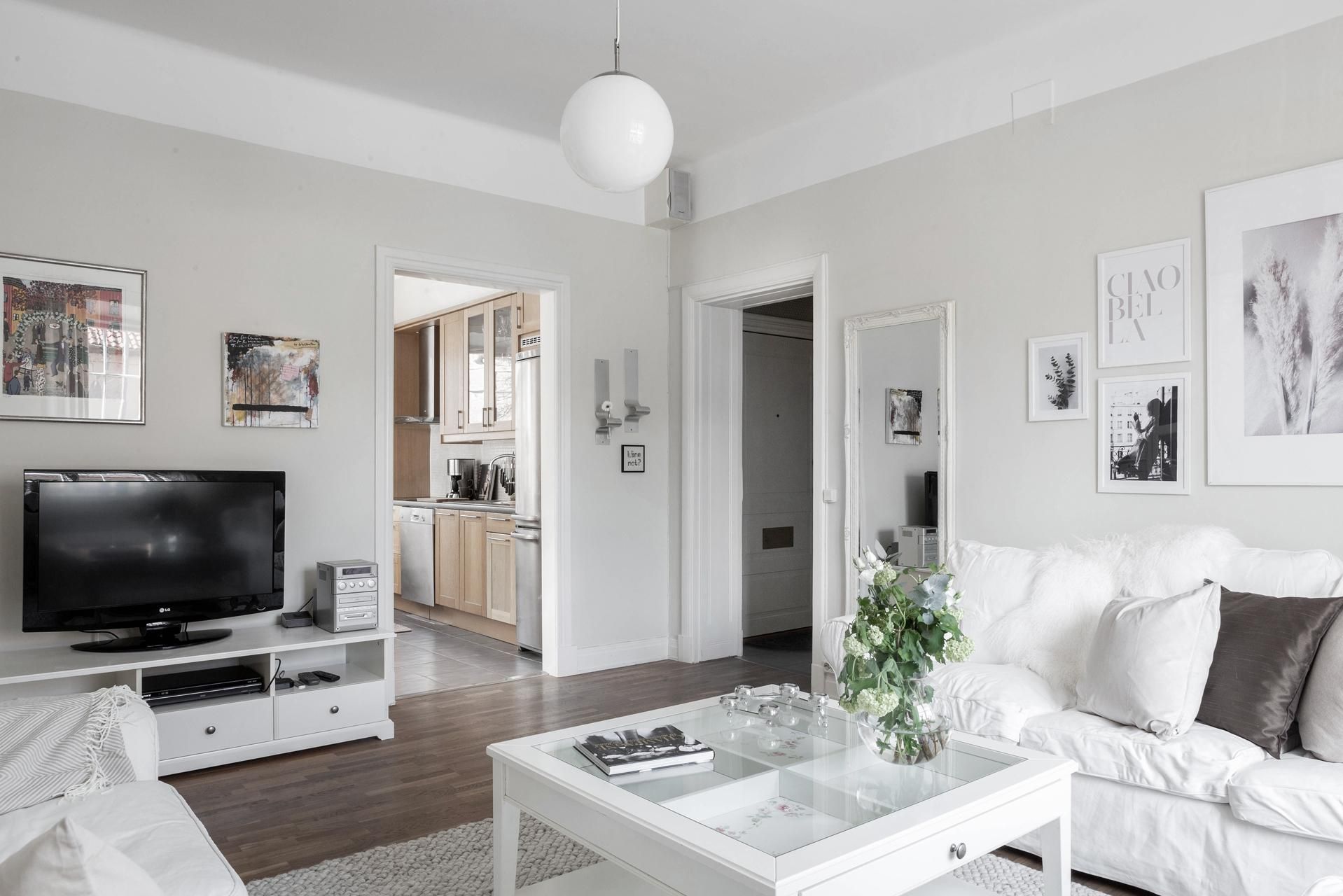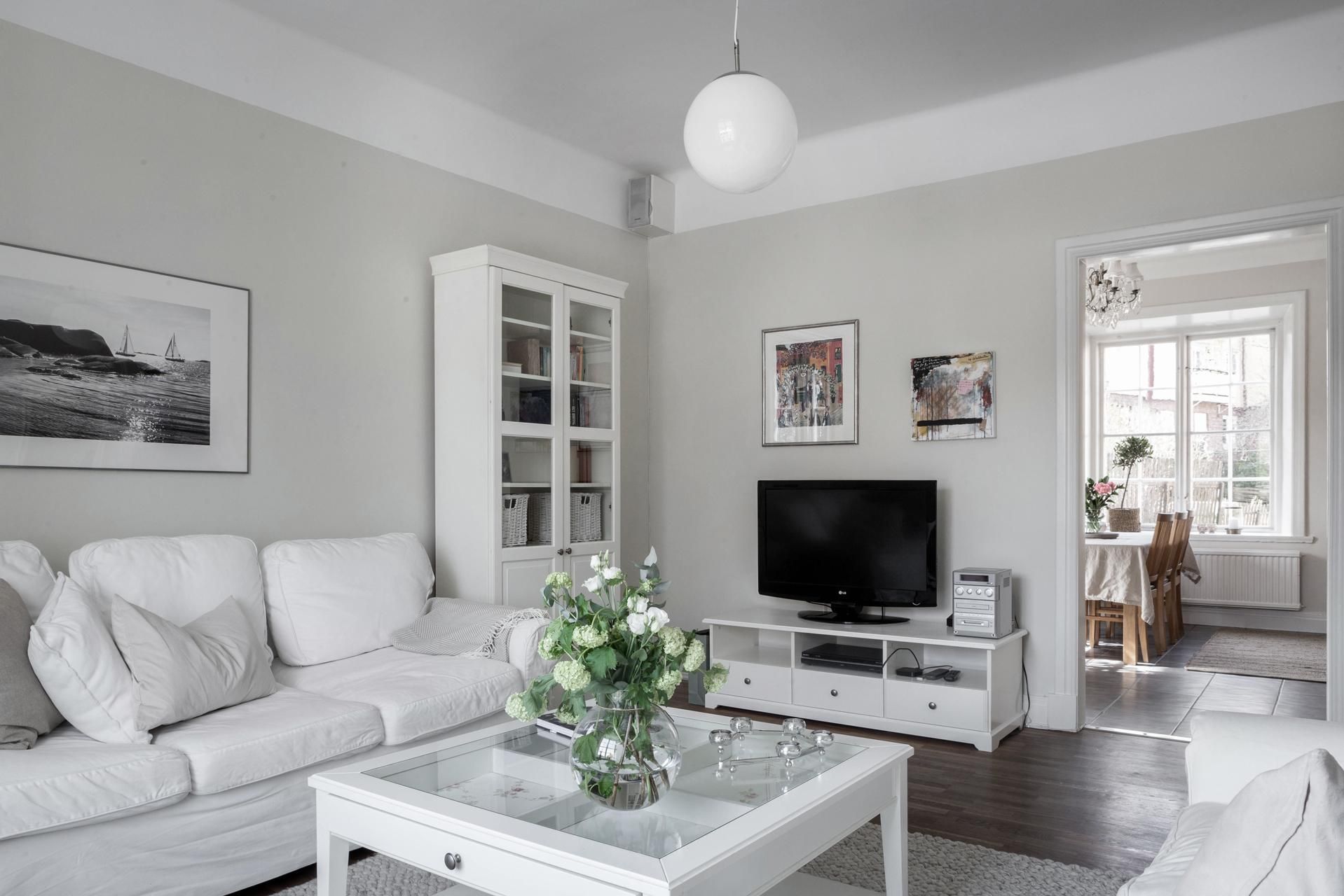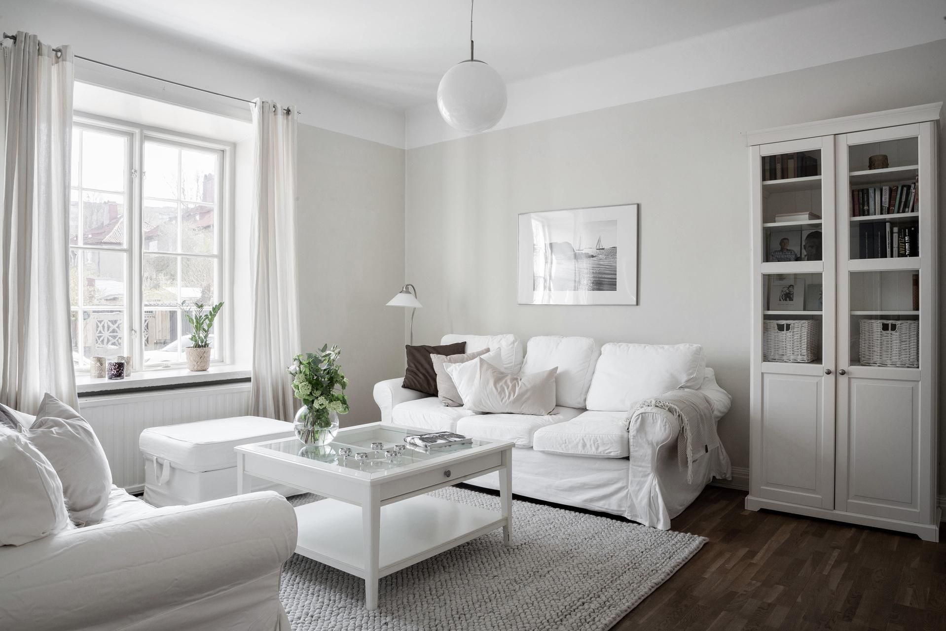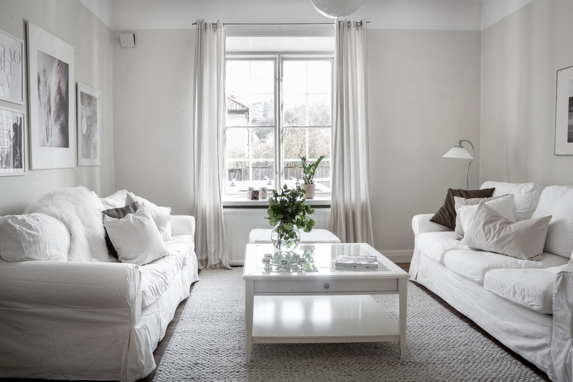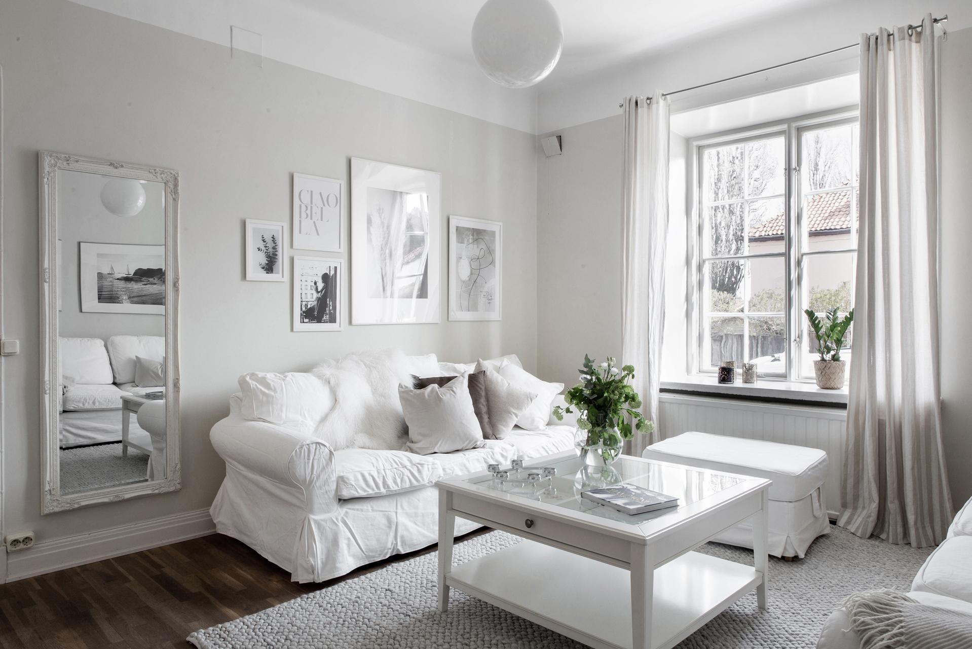 Kaunis, romanttinen olohuone, jossa valkoinen sisustus